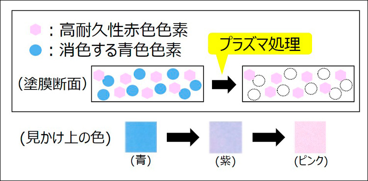 本稿で解説する『PLAZMARK』大気圧プラズマ用の変色原理は前者であり、高耐久性の赤色色素と、ラジカルとの反応性が高く、分解や構造変化により消色する青色色素を組み合わせることで、プラズマ照射により青色からピンク色へと変色する(図2)。