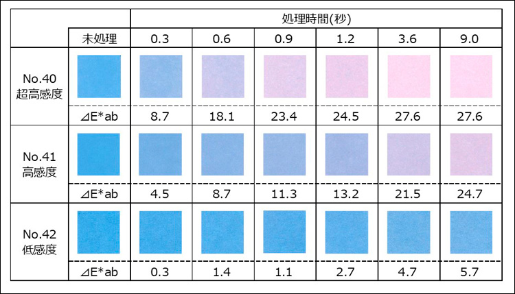 従来の試験紙タイプの『PLAZMARK』大気圧プラズマ用は、感度3段階、形状2種類の計6銘柄展開している。具体的なサイズは35×300mmで、貼り付け可能なロングラベル形状と210×300mmのシート形状がある。感度は、比較的強いプラズマ処理用の低感度(型式No.42)、一般的な処理用の高感度(型式No.41)、高速またはソフトな処理用の超高感度(型式No.40)をラインアップしている。