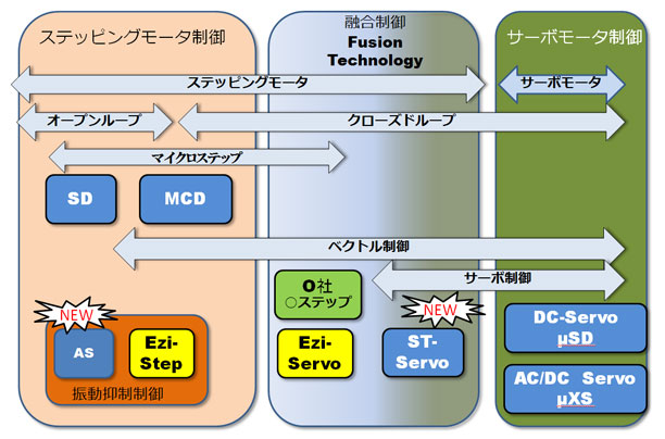 池野:私共の業界は非常に競争が激しく、大手メーカーと同じ土俵では勝負していくことが難しい状況です。何か特徴をもたないと、お客様にも受け入れてもらえません。当社は、サーボモータが得意だったのですがその後ステッピングモータにも進出していき、それからサーボモータとステッピングモータの中間となる新しいジャンルの融合制御領域に注目していきました(図1)。
