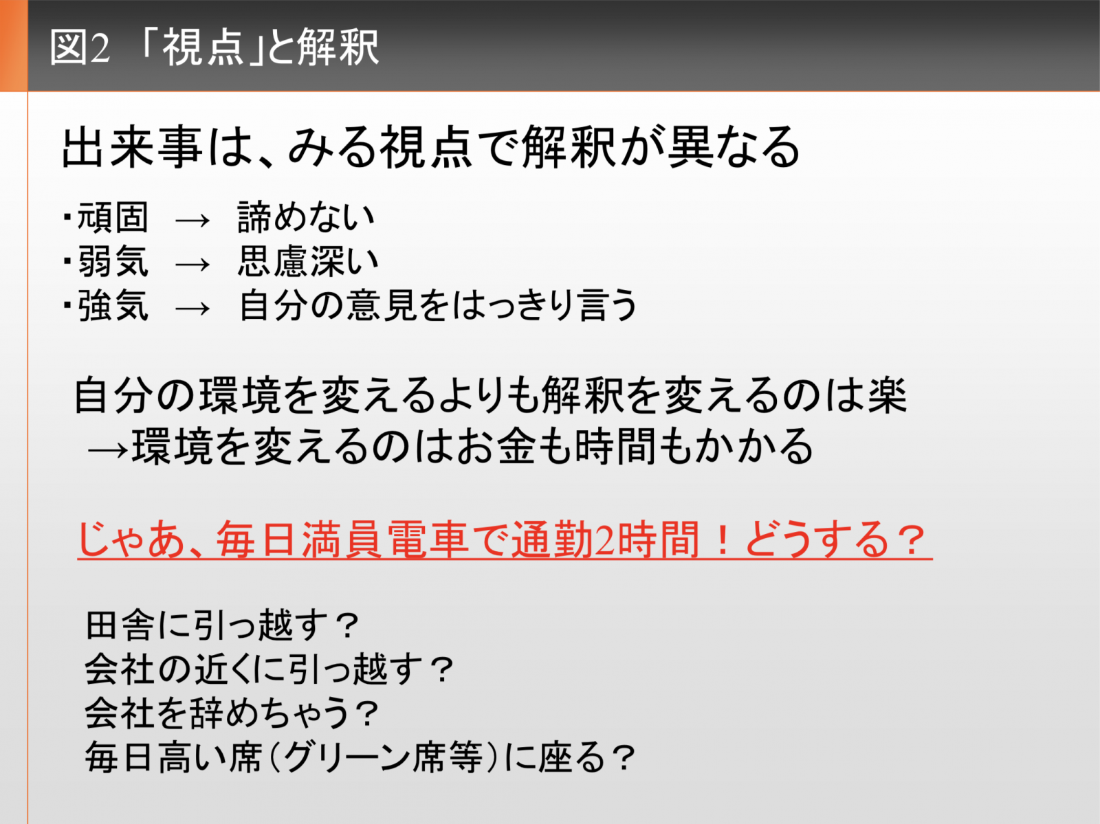 しかし周りを変えようとすることができるのは、非常に大きな力をもっていないと不可能である。お金も時間もかかるのである。解釈を変えることは、お金も時間もかけずに簡単に変えることができる。
