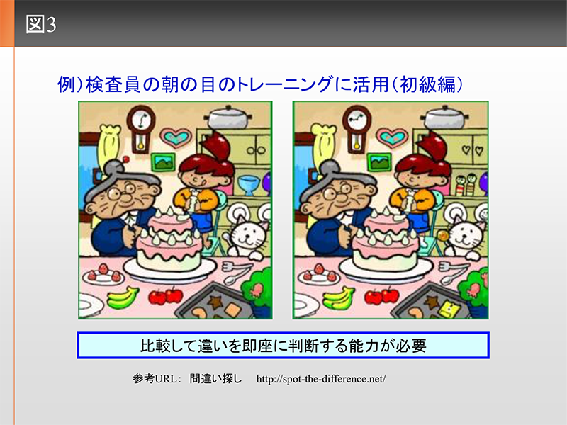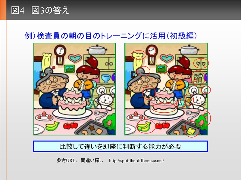 間違い探しだけではなく、『ウォーリーを探せ』など、趣向を凝らして作業者に飽きさせない工夫が必要である。