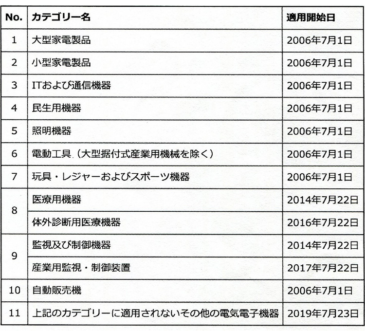 2000年前後から欧州委員会が検討していたRoHS指令のドラフト(draft : 草稿)を入手できるようになり、その内容が明らかになった。しかし、その内容は筆者にとっては哲学書のような難解な表現であり、技術論文のようには頭に入ってこない印象であった。2019年7月の改訂で、規制物質としてフタル酸エステルが追加(表1-1)され、規制対象機器(表1-2)も拡大した。本稿を執筆するにあたり、新ためてRoHS指令の規制対象除外機器を調査して驚いた。加盟国の安全保障上の本質的利益を守るために必要な機器として、軍事目的の武器、軍備品戦争材料にはRoHS指令を適用しないことと記載されている。筆者がJEITAに参画中にはこのような項目は無かったように思うのだが。太陽光発電パネルも規制の対象から除外されているが、前職企業では鉛フリーはんだ化が完了されていたと記憶している。宇宙に送り出す機器も規制の対象外となっている。Sn-Ag-Cuの特許を取得した会社が「鉛を含有しないはんだ」を開発した目的は、材料の軽量化を目指した結果であったらしい。