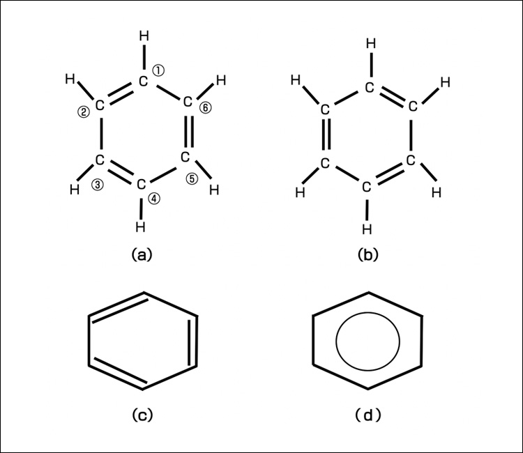 ベンゼンとは炭素6個と水素6個からなる物質で、分子式ではC6H6で、構造式は図1-2の(a)或いは(b)のように表示する。(a)と(b)の違いは二重結合の位置が異なっているだけであり、その他は同じである。ベンゼン環を示す時、毎回(a)や(b)のように書くのは面倒なので(c)や(d)に書くことがあるが同じ意味である。