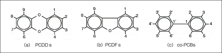 ダイオキシン類の基本構造は2つのベンゼン環を2個の酸素で連結し、水素の一部を塩素に置き換えたポリ塩化ジベンゾ-パラ-ジオキシン(図1-3(a)、PCDDs : 異性体75個)、2つのベンゼン環を1個の酸素で連結し、水素の一部を塩素に置き換えたポリ塩化ジベンゾフラン(図1-3(b)、PCDFs : 異性体135個)、2つのベンゼン環を直接連結し水素の一部を塩素に置き換えたコプラナーポリ塩化ビフェニル(図1-3(c)、co-PCBs : 異性体10数個)である。コプラナーとは同じ平面上にあるという意味である。ダイオキシン類は塩素がベンゼン環のどの位置の炭素(番号で表示)についているか、何個ついているかによって構造が異なり毒性も異なり、多くのパターン(異性体)が存在するためスモール(s)をつけている。したがって、ダイオキシンという単体の化合物は存在しない。毒性を評価する時、最も毒性が強いのはベンゼン環の2,3,7,8,の炭素の位置の水素が4個の塩素が置き代わった四塩化ジベンゾ-パラ-ジオキシンであり、この化合物の毒性を1として他のダイオキシン類の毒性を比較したのを毒性等価指数(TEF)と呼ぶ。勿論、臭素化難燃剤のように、塩素が臭素に置き換わった場合の毒性についても調査されている。