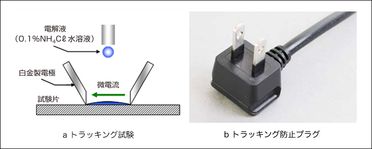 競争の激しかった家電業界では基板コストを低減させる目的で、安価な紙フェノール基板を使用するのが常であった。一方で、紙フェノール基板はしばしば発煙 ・ 発火事故を引き起こした。冷蔵庫、洗濯機、テレビの発煙・発火事故は絶えることは無かった。生基板の表面で放電による電気の通り難さ(炭化による燃え難さ)を示す試験がトラッキング試験である。具体的には図1-4(a)のように、試料基板に電極を接触させた状態で電極間に塩化アンモニウム(NH4Cℓ)電解液を滴下し、絶縁性が破壊に至る電圧で評価する。トラッキング特性を評価する方法としては「比較トラッキング指数 : CTI」と「保障トラッキング指数 : PTI」がある。CTIは材料の品質管理手段として、PTIは0.1%NH4Cℓを30秒間隔毎に1滴ずつ滴下し、50回滴下しても短絡が起きない保証電圧がPT1となる。