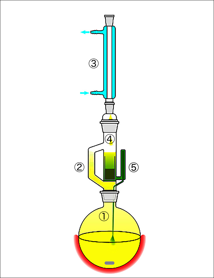 いずれも有機物であり、前処理としてソックスレー抽出器(図1-6)で目的物を抽出する。ソックスレー抽出器を解説する。フラスコ①に有機溶剤を加え、ヒータで加熱する。発生した有機溶剤の蒸気は②を通過し、冷却器③で冷却されソックスレー抽出器④に溜まる。ここには試料入れた筒型濾紙があり、目的の有機物を抽出する。抽出器の溶媒が⑤から溢れると、一気にフラスコに戻る。フラスコからの蒸気は純粋な溶媒のみであり、抽出された有機物はフラスコ内に濃縮されるのである。