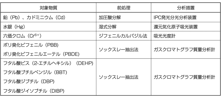筆者は長年湿式分析(固体を酸やアルカリ溶融して溶液化し、目的元素を発色させて吸光高度計で定量分析するか、沈殿させてその重量を測る)を実施してきた。その後、物理原理を利用したSEM-EDX、蛍光分析、EPMA等の機器分析で材料の解析を担当してきた。その経験から、RoHS規制物質の対象物質の定量分析方法の一例を表1-3に示す。六価クロムの分析方法については、項目1-1-4に示しているので詳細な解説は割愛する。