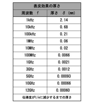 信号が高周波となると、信号電流は導体の表面を主として流れる。周波数の関数で、その厚さ(δ)は次の式となる。周波数と厚さの関係は表4に示した。