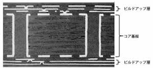 この基本的な構造はビルドアップ層の支持体としてコア基板を用いている。このコア基板は厚さが大きく、低密度のため伝送特性が劣化するので、コアレス基板が必要となってきている。
