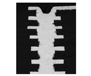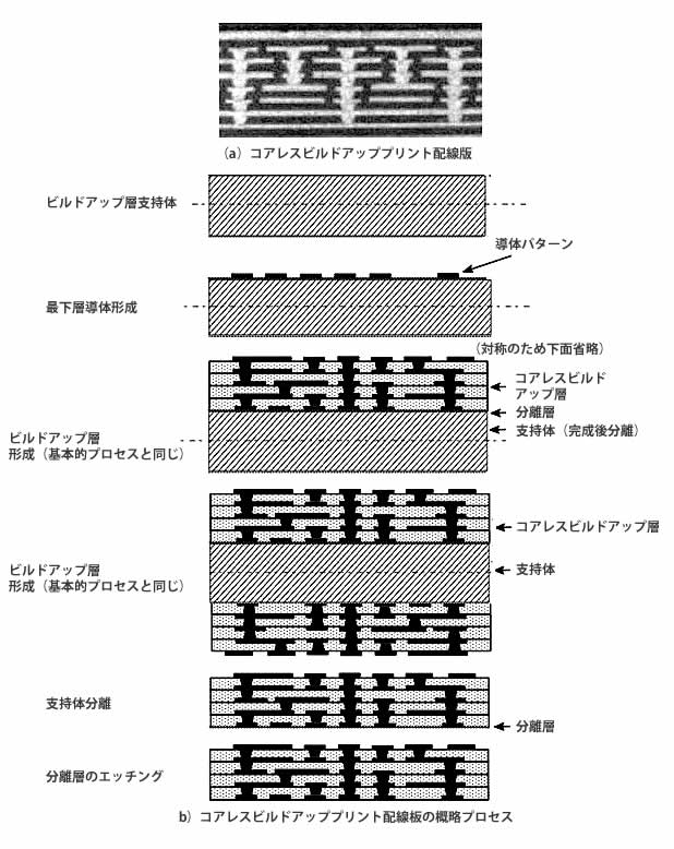 高精細パターンを作るにはフィルム状のビルドアップ用絶縁材料を用いている。この材料は薄く、機械強度が小さいので、取り扱いが難しくなる。コアレスビルドアッププリント配線板の例を図5に示した。図5(a)はコアレス基板の断面、そのプロセスの概略として図5(b)に示した。プロセスの要素は基本的なものとほとんど同じであるが、作成においては支持体が必要で、完成後支持体を分離する。使用に当たってもスティフナーなどが必要なことがある。