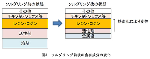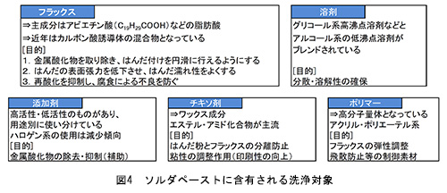 まず、洗浄時の洗浄対象物に関しては、ソルダリング前後で図3のように変化し、ソルダリング後は「フラックス」「チキソ剤」「活性剤」が主体となった混合物に変化することとなる。そして熱変化が加わることで「金属塩」が発生する。有機溶剤を主体とした洗浄で長らく日本は洗浄を行ってきたが、近年は状況が変化してきている。環境規制の観点だけではなく、前号で既報となっているが、ソルダペーストには性能向上の為、様々な物質が添加されるようになり、ソルダリング後には、「チキソ剤用途の新規有機化合物」「レアメタル金属による新規金属塩」の影響により、洗浄は難しさを増しているのである。この点に関してより詳細に論述するために、ソルダペーストに使用されている主な物質名を以下に記載する(図4)。