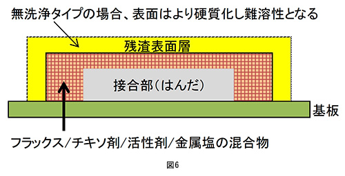 実際に残渣は図6のような状態となっており、表面は難溶性層で硬質化し、なおかつ内部はチキソ剤を主体とした混合体で構成されているため、「溶解洗浄での洗浄」は著しく限定されてしまうこととなる(図7)。