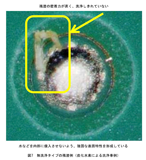 特に無洗浄タイプのソルダペーストの場合、洗浄はより難化してしまう傾向となる。近年の無洗浄タイプのソルダペーストは、残渣表面をより硬質化させている。これは残渣内部を完全に封止することで、水や空気の接触を断ち残渣を安定性化させる為である。いっぽうで、完全な硬化状態では物理的衝撃や経時変化により、残渣にクラックが発生してしまうため、それらを防止する観点から残渣内部は適度な弾性を維持できる仕様となっている。