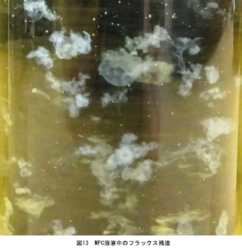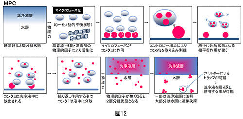 難溶性物質への対応力が近年のフラックス洗浄のカギとなっている状況において、当社はそのソリューションをもち合わせている。当社洗浄剤の1つMPC洗浄剤は印加物理力(撹拌・加温など)による活性化(マイクロフェーズ化)状態となった後、剥離洗浄を主体とした剥離+溶解のダブル方式の洗浄を行なえるため、強力な洗浄性が確保できる(図12)。