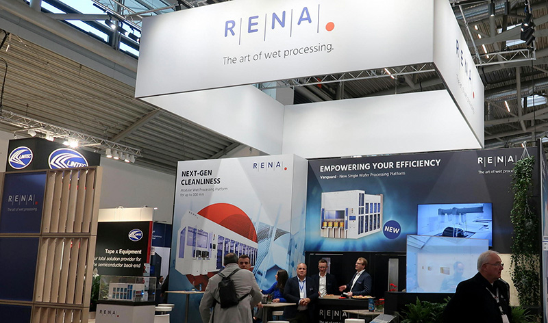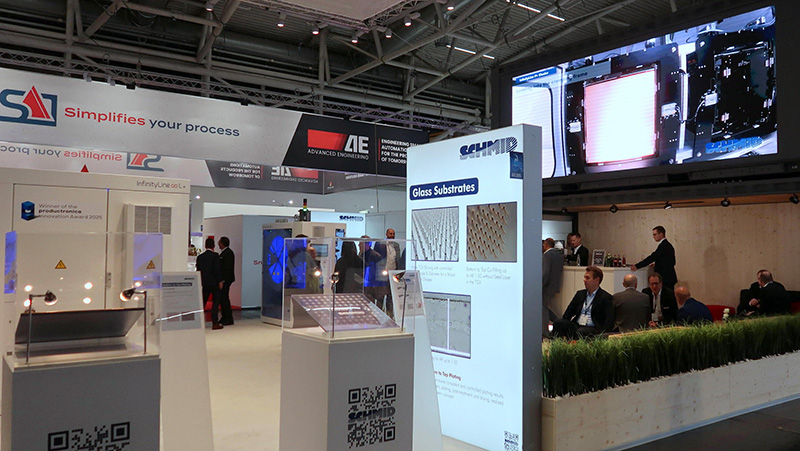 ガラス実装関連では、TGVレーザ穴あけや加工を得意とするLPKF(写真10)、ガラスキャリアとガラスへのCuめっきを展示するPlan Optik(写真11)、めっきラインが得意なSchmid(写真12)、 TGVガラスエッチングで特徴を示すRena(写真13) が展示した。
