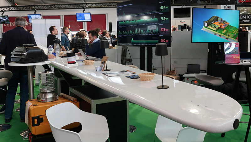 ドイツの産業を引っ張り続けている、Fraunhoferのブース(写真5)はユニークで、風力発電用ブレードを利用したカウンタテーブルには驚きがある(写真6)。
