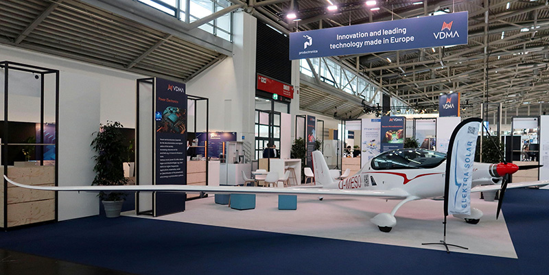 2人乗りで最大3時間飛行できる静かな超軽量機Elektra Trainerの現物も展示された(写真8、9)。12.5kWの出力で、時速120kmの巡航飛行が可能。ドイツSchweizer AG社のSiCパワーデバイスIC部品内蔵のモジュールがインバータ・モータコントローラとして採用されている。