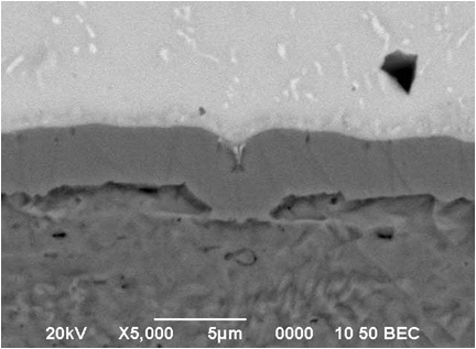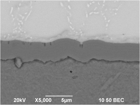 次に粒界腐食の程度を調査した。今回は鉛フリーはんだSn3.0Ag0.5Cuにて、白光(株)製のソルダリングポット『FX-301j』を使用し、240℃で5secはんだDipの後、断面によるSEM観察を行った。図4に金属顕微鏡写真によるはんだ接合部の全体像を、図5及び6にSEM写真による粒界腐食を示す。