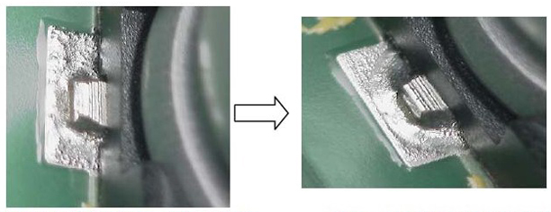 右:プロファイル調整後のアルミ電解コンデンサ。はんだの界面がきれいな曲線を描いており、ぬれ広がりは良好