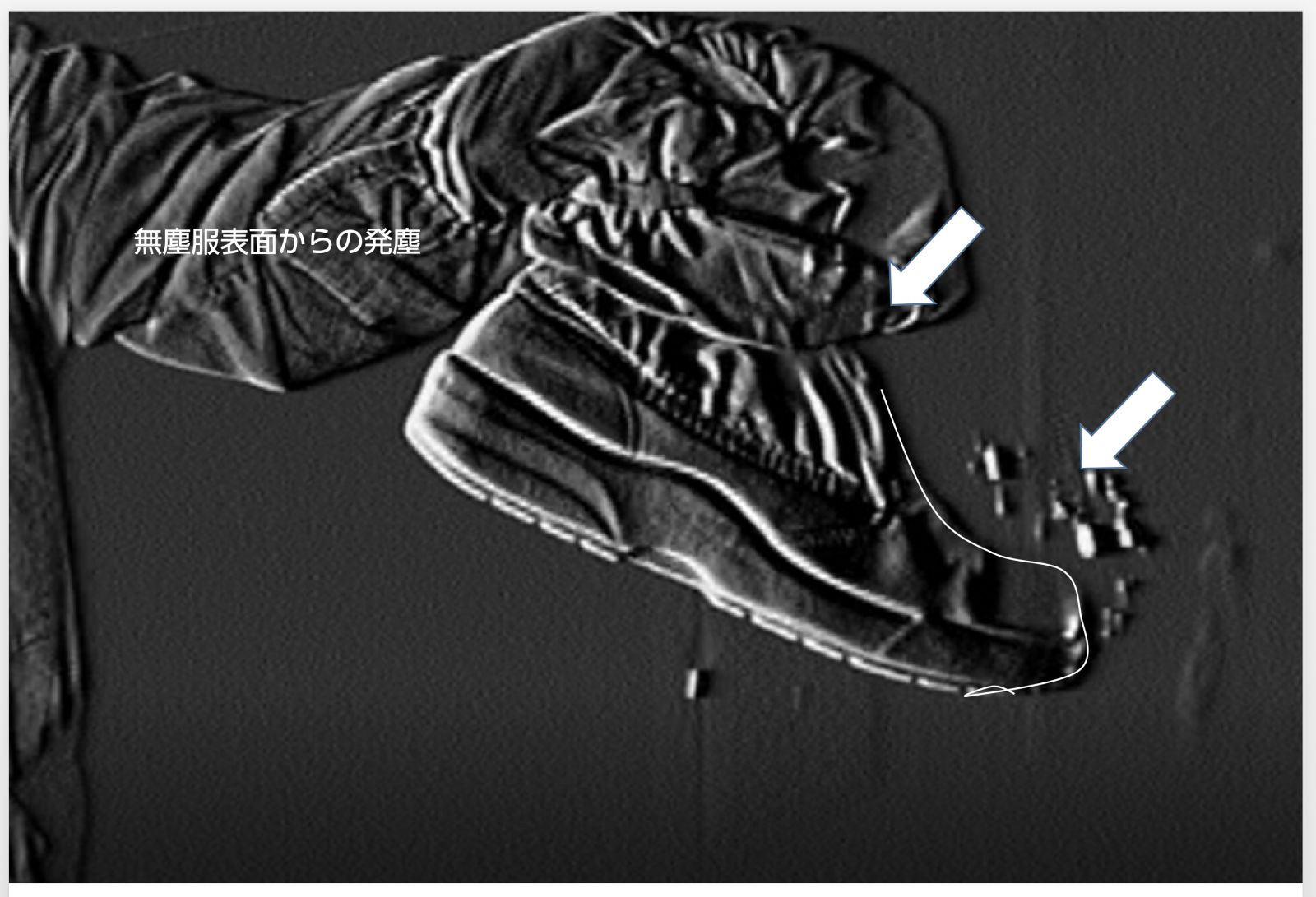 図中矢印部に発塵が見られるが、これは靴底やつま先部分からの発塵ではなく、くるぶしから上側のゲートル部分からのものである。