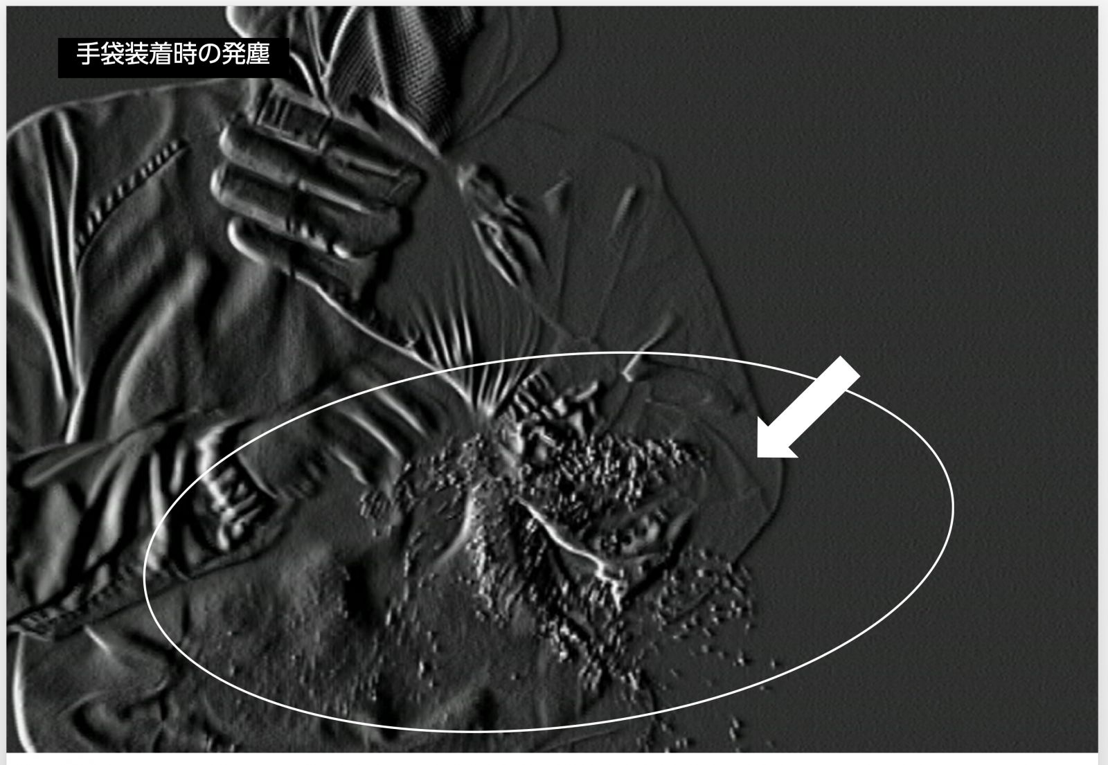 無塵服手袋自体の発塵は少ないが、装着や脱着時には、無塵服の袖部から相当な発塵が見られる。