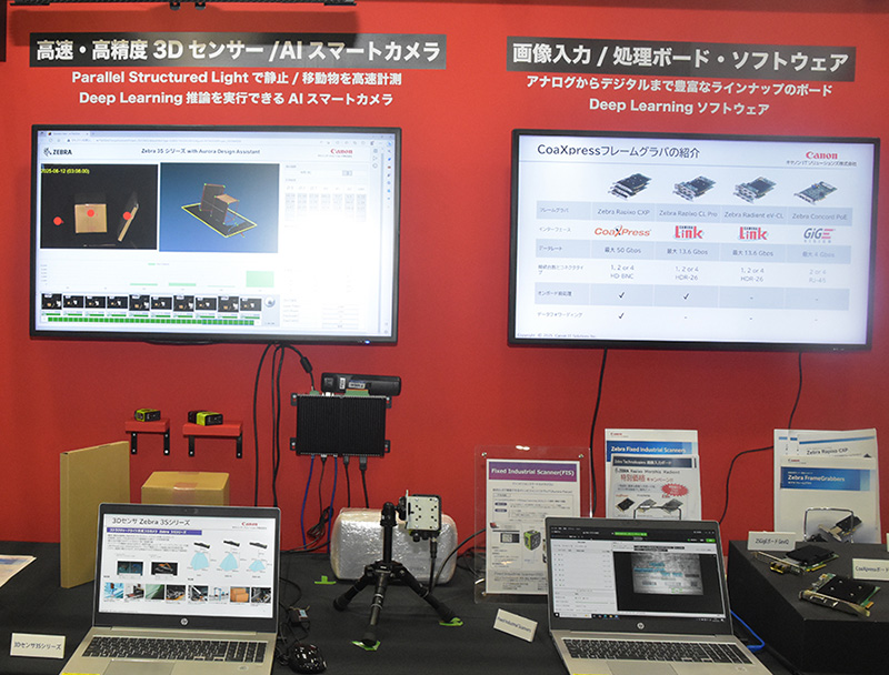 キヤノンITソリューションズ(株)は、静止物 ・ 移動物の寸法を一瞬で計測する高解像度 ・ 高速3DセンサであるZebra 3Dセンサ3Sシリーズの『3S80』の展示を行っていた。