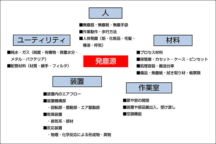 ユーティリティでは、配管類や部材が錆びていると、他との衝撃や衝突あるいは接触で脱落し強烈な発塵につながるので、錆びさせないことが必要である。また、溜まり水や淀み水はバクテリア(主にPseudomonas菌:棹菌)の富養源となり、生菌、死菌ともに金属汚染を引き起こすので、乾燥して飛散した場合、浮遊塵埃の発生源ともなる。純水中のバクテリアは、細胞内にFe、Cu、Al、Mg、Caなどの金属元素を取り込み、数日以内に100万個レベルまで増殖する。また、装置の電源ケーブル類は電気的に絶縁性であるから、空気が流れ込んでくると静電気が発生し、ESAによる塵埃汚染を引き起こす。この他に作業環境で考えられる発塵源は他にもたくさんあるが、すべての構成物が発塵源になると言う認識をもっていていても必ずしも間違いではない。