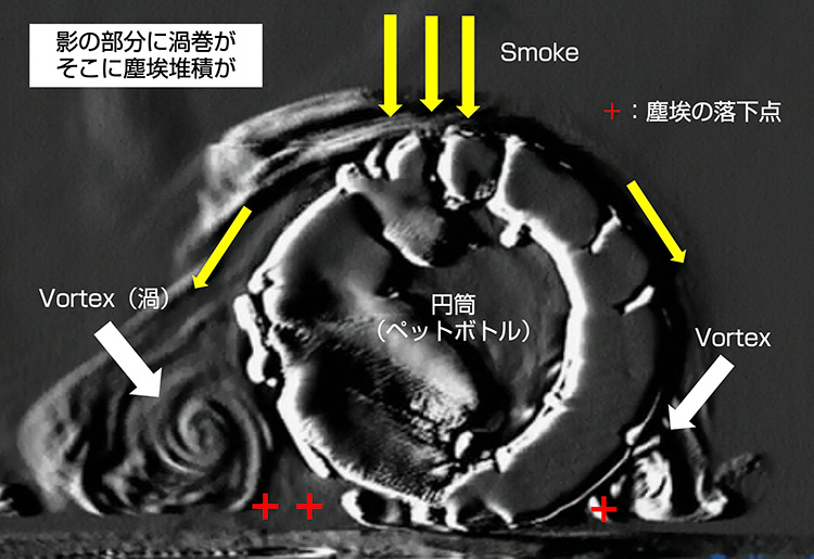 この写真はClass100のクリーンルーム内において、グリーンレーザを用いて塵埃の挙動を可視化する実験の一つとして実施したものである。台上にペットボトルを置き、その上から別のペットボトルに詰めたタバコの煙を真上から落とした様子を、横側からグリーンレーザ光による散乱光を見たときの動画の1コマである。落下したタバコの煙は台上とペットボトル近傍で両側に潜り込み渦を巻いていることが分かる((+)部分)。渦の発生はペットボトル断面方向のR形状でも発生する。このように気流はR形状も含めてコーナー部や急激な拡大縮小形状部において渦を発生させる性質がある。一般的に塵埃は気流に乗って浮遊するため、このように渦巻きが発生すると気流の運動エネルギーはその部分で消費され、失速する傾向を示す。このため気流中の塵埃はこの近傍で落下しやすくなる。つまり(+)部分に塵埃が堆積する。実際の作業室では、壁側や装置の裏側など、気流が衝突し失速や停滞しやすい場所に塵埃が多く堆積することが多い。