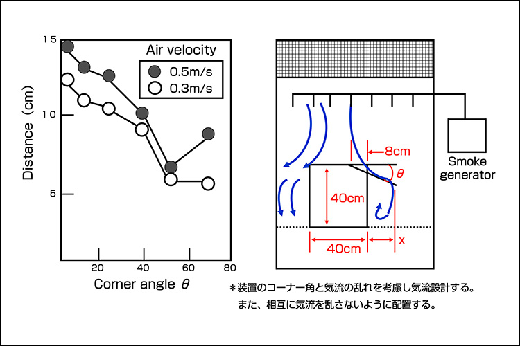 右図では実験に用いた40×40×40cm3の立方体の側面を示す。このコーナー部を角から8cmの部分から角度θを変化させ、スモークの流速を変えて気流の乱れ幅Xを計測すると、左図のようになる。θ=0、すなわち平面で直接スモークを当てると、気流の乱れ幅Xは風速0.5m/secで15cm、0.3m/secで12.5cmと広がる。θを変化させると、50°でそれぞれの流速での乱れ幅Xは約6cmと最小となる。このことからコーナー部の面取りは、気流の乱れを抑制する効果があることが理解できる。