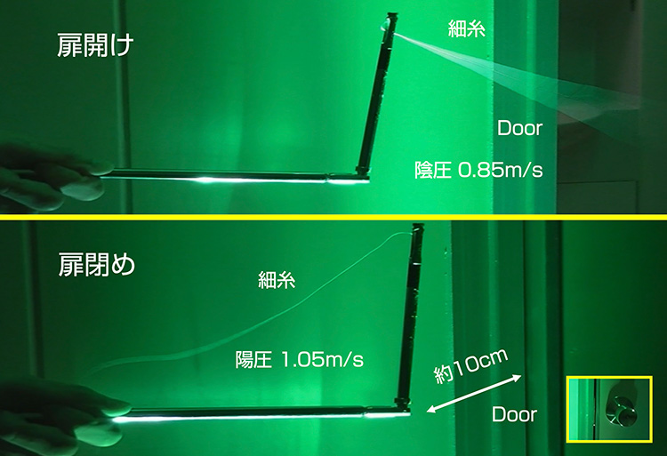 上側が扉を開けたとき、下側が閉めたときの写真である。L字の棒状のものは、熱線気流風速計で発生する気流の測定装置である。この棒の先端部分に細い糸を結び付けており、たなびく方向で気流の向きを、たなびく角度で気流の強さを判定した。この方法をタフト法と称し、現場で気流の流れを簡単に確認できる方法である。これは後方乱気流(wake turbulence)と同じ現象である。気流風速計で測定した結果、ドアを開くと近傍で陰圧となり0.85m/sの気流の発生を確認した。これはドアを外側に開けた時、ドアの内側の空気が扉とともに引きずり込まれたために、陰圧となり近傍の空気が流れ込んだことによる。一方、ドア閉め時にはドアの内側の空気はドアの外側に押し出されて、1.05m/sの陽圧の発生を確認した。陰圧の場合で外側の清浄度が低いと気流が大きく乱れることでたくさんの塵埃が巻き込まれて清浄度が高い方向に流入する。陽圧の場合はドアの外側近傍で気流が大きく乱れ塵埃が巻き上がることになる。このようにドアの開閉で発生する気圧の変化は比較的大きく、気流を大きく撹乱させる原因である。