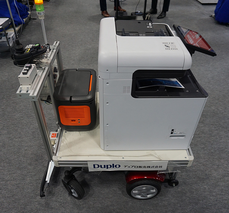 デュプロ販売(株)は、製造業、物流、医療、飲食など、様々な現場で活躍する人手不足を強みに変える『協働搬送ロボット』の展示を行っていた。
