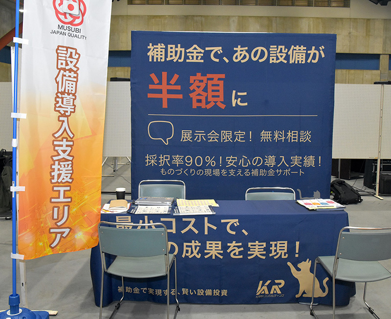 ブースでは、新商品やサービス開発に関する設備投資や開発費用の『ものづくり補助金』の他、省力化に関する設備投資に利用可能な『省力化投資補助金(一般型)』、成長産業である取り組みが対象の『新事業進出補助金』、売上高100億円企業を目指す言葉が必要な『成長加速化補助金』、投資額10億円以上の『大規模成長投資補助金』など、製造業におすすめの補助金について概要や用件をまとめた資料を作成し、来場者に配布していた。『ものづくり補助金(通常枠)』の概要を紹介しておくと、対象は革新的な新製品 ・ 新サービス開発の取り組みに必要な設備 ・ システム投資で、補助率は1/2、年3〜4回開催予定となっている。