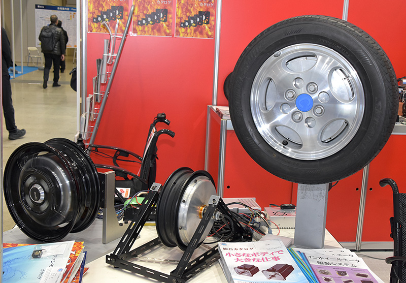 コアレスモータ(株)は、幅広いモータバリエーションをもつ『インホイールモータ駆動システム』の展示を行っていた。