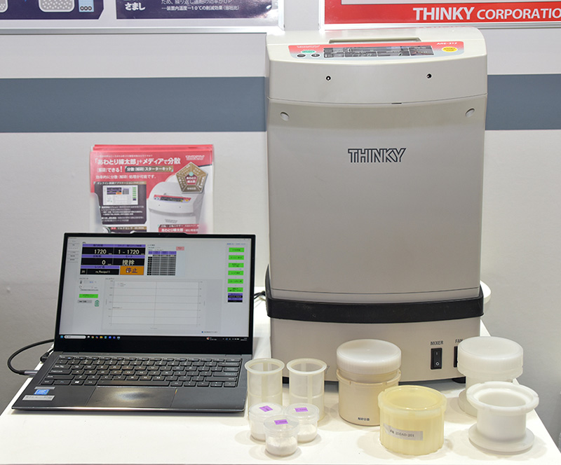 (株)シンキーは、大気圧タイプの自転・公転ミキサで通信機能を搭載した『あわとり練太郎ARE-312』の展示を行っていた。