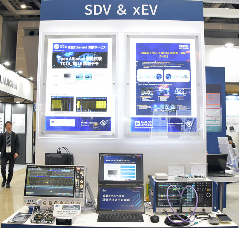 ローデ・シュワルツ・ジャパン(株)は、プロコトルデコードとコンプライアンステストに両対応し、10BASE-T1Sや10BASE-T1の評価に適した『車載イーサネット評価パッケージ』の展示を行っていた。
