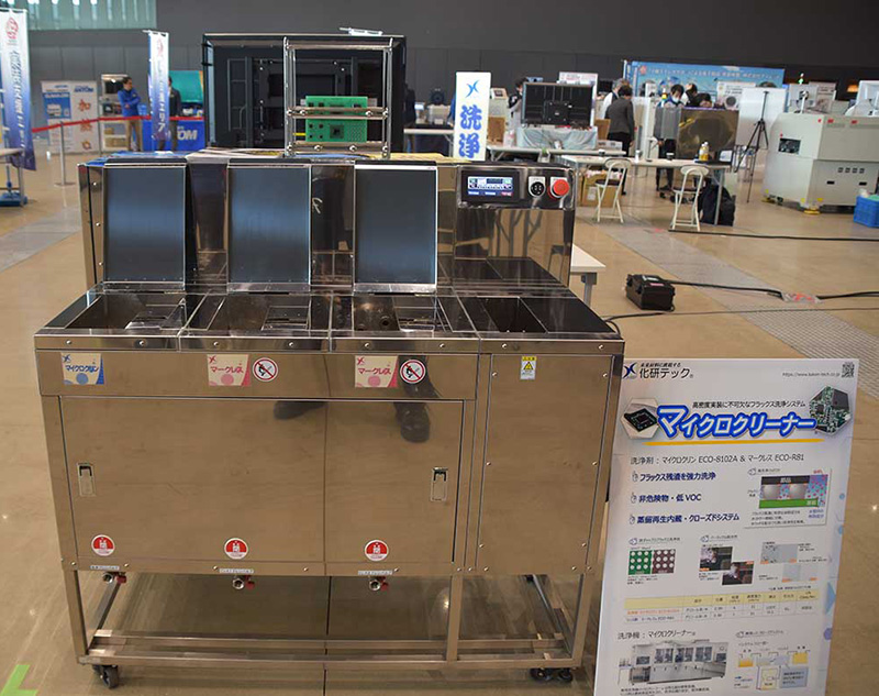 化研テック(株)は、リンス剤を装置内リサイクルする洗浄装置『マイクロクリーナー』と高機能な洗浄剤『マイクロクリン ECO-8102A & マークレス ECO-R81』による『フラックス洗浄システム』を紹介していた(写真6)。