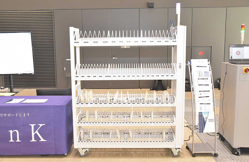 KnK(株)は、SMT生産現場に最適化された次世代のスマート自動化ストレージシステム『REEL STOCKER』の紹介を行なっていた(写真7)。