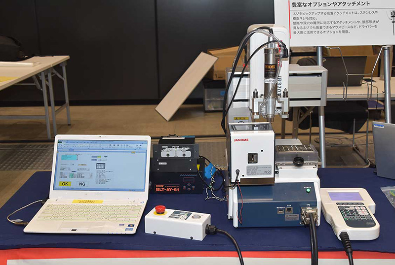 (株)ジャノメは、ねじ締め工程の自動化を容易に実現する高剛性・高精度・簡単操作で、ねじ締めミスや品質のバラつきを防止して生産性を向上させる卓上タイプの自動ねじ締め機『JR3000』シリーズを紹介していた(写真10)。