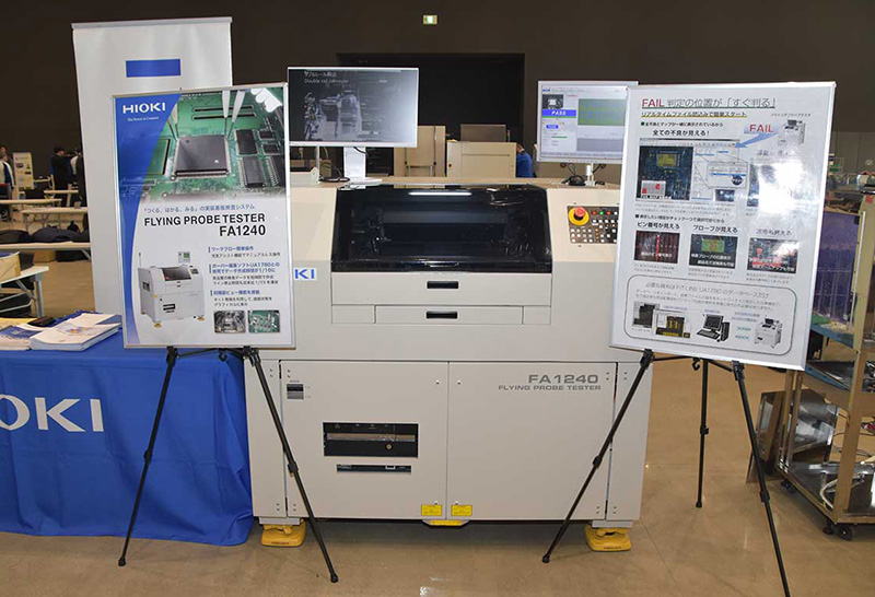 日置電機(株)は、データ作成・電気検査・不良の確認が連携することで品質の向上と工数の削減を実現するフライングプローブテスタ『FA1240』を紹介していた(写真13)。