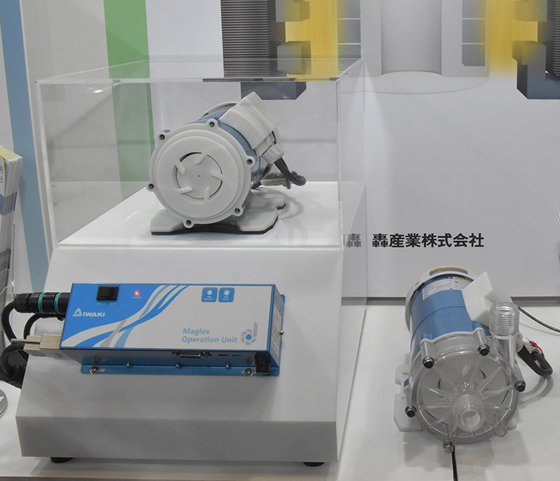 (株)イワキは、磁気軸受構造とマグネット駆動方式を組み合わせた渦巻きポンプ(特許出願中)『MJ-100』の展示を行っていた。
