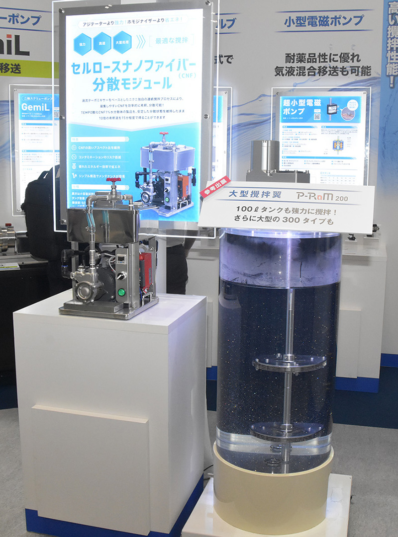 (株)ニクニは、100ℓタンクも強力に攪拌する大型攪拌翼『P-RaM200』を参考出品していた他、小容量試験用プロトタイプの『セルロースナノファイバー分散モジュール』などの展示を行っていた。