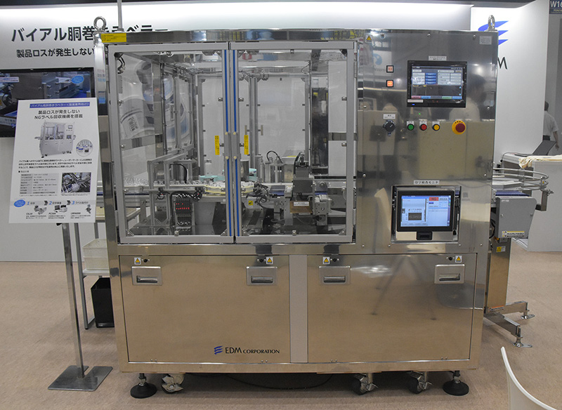 イーデーエム(株)は、製薬業界向けのバイアル瓶胴巻きラベラ『全画像保存機能付き印字検査機』の展示を行っていた。