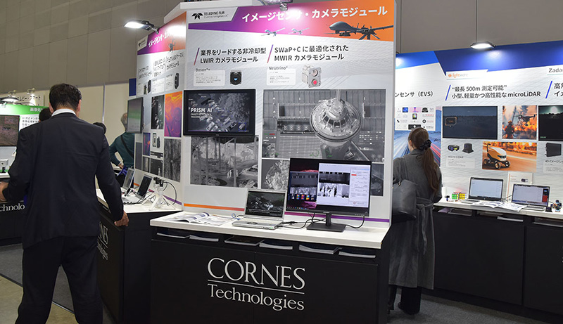 同社は、エレクトロニクス関連機器や電子部品などの販売・マーケティング・技術支援、ダイヤ成膜装置の設計・開発・製造・販売などを展開しており、ブースでは取り扱い製品の展示をカテゴリーごとに紹介。イメージセンサ・カメラモジュールでは、小型・軽量・低消費電力を実現した非冷却型LWIRカメラモジュール『Boson+』、SWaP+Cに最適化されたMWIRカメラモジュール『Neutrino』などを展示・紹介していた。