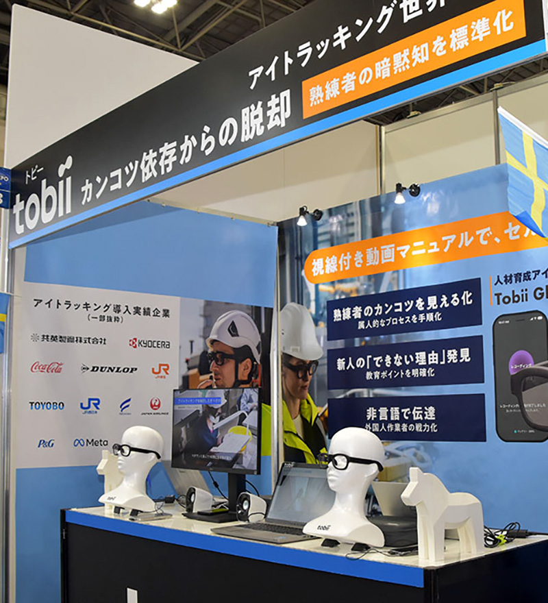 トビー・テクノロジー(株)は、人材育成アイトラッキングスマートグラス『TOBII GLASSES X』の展示及び同製品を活用した視線付き動画マニュアルの提案を行っていた。