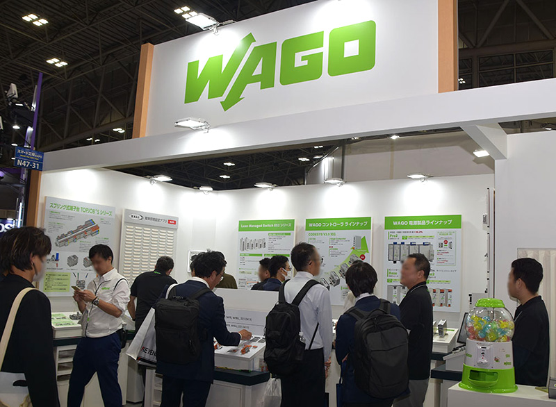 ワゴジャパン(株)は、産業用イーサネットスイッチ『Lean Maneged Swich 852』シリーズ、大規模なアプリケーションの制御や調整が可能なコントローラ『PFC300』、高性能・多機能パワーサプライ『WAGO Pro2』シリーズなどの展示を行っていた。