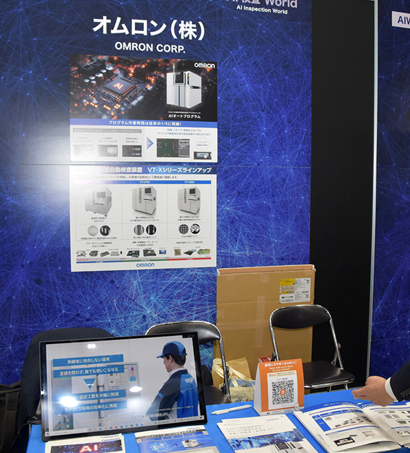 オムロン(株)は、AIにより検査プログラムの初期設定を自動化し、プログラム作業時間を従来の1/5に短縮する「AIオートプログラム」を備えた基板外観検査装置『VT-S10』シリーズの紹介をパネルやパンフレットで行っていた。