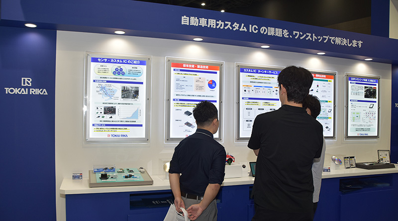 (株)東海理化は、「自動車用カスタムICの課題を、ワンストップで解決します」をブースに掲げ、磁気センサ製品やカスタムIC製品などの特徴をパネルで紹介するとともに、各種製品の展示も行っていた。