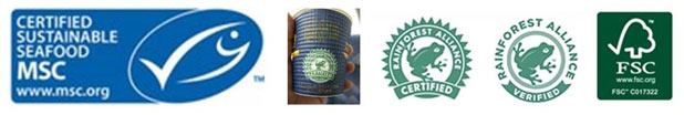 レインフォレスト・アライアンス認証マークは、コーヒー、バナナ、生花、植物など様々な農産物のほか、材木、紙、その他の森林資源製品に対して認証するもので、写真32に示すようにコーヒーカップにカエルの認証マークが付けられている。神戸屋レストランで出されるコーヒーがレインフォレスト・アライアンス認証を取得しているものである。これは1989年に『スマートウッド』プログラムを立ち上げ世界初の林業認証制度を策定し、市場の力を利用して森林保護に努める初の組織となり、1993年に森林管理協議会(FSC)創設に貢献した経緯がある。FSCは1993年10月にカナダで創設されたNGOで、生産を行う森林や製品、流通過程の評価、認定、監督を行う国際的に活動している組織で、本部はドイツのボンにある。各企業で発行される環境報告書やCSR報告書には、FSC認証された紙を使用し、それを明示するためにFSC認証マークを裏表紙にも記載している(写真32)。