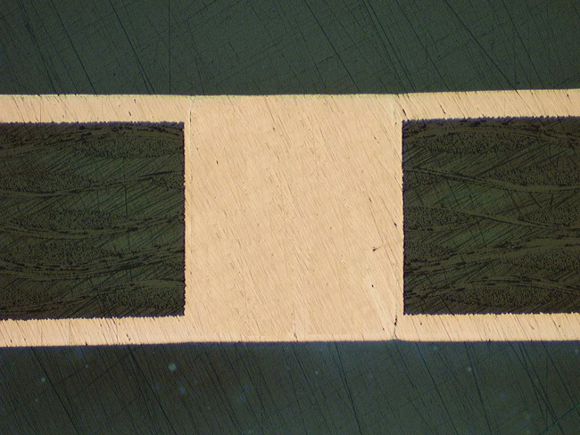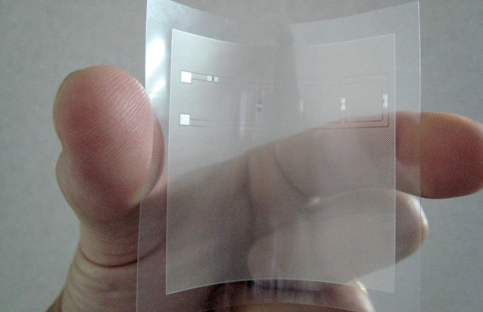 また、透明フレキシブル基板『SPET』は、厳密にいえば、導体に銅箔を用いているため、完全に透明ではない。導体を透明にする方法として透明導電膜インキを印刷することで導体を透明にすることは可能である。しかし、透明フレキシブル基板『SPET』の特徴である高耐電流、低導体抵抗を特徴としているため、この方法は用いることができないし、イノベーションにはならない。今、新たなイノベーションで透明フレキシブル基板『SPET』の導体を透明にすることを試みている(図6)。これができれば、文字通りの透明フレキシブル基板『SPET』が完成となる。