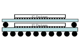 このため、これまでのモバイル用メモリ規格であるLPDDR規格やLPDDR2規格では一般的なコントローラICとメモリを基板上に実装する規格のほか、コントローラICの上にメモリICを実装するためのPoP(Package on Package)実装が規格化されていました(図19)。このWide I/Oメモリ規格では、PoP実装ではなく、コントローラチップの上に直接メモリチップを実装するチップの3D実装が規格化されています(図20)。